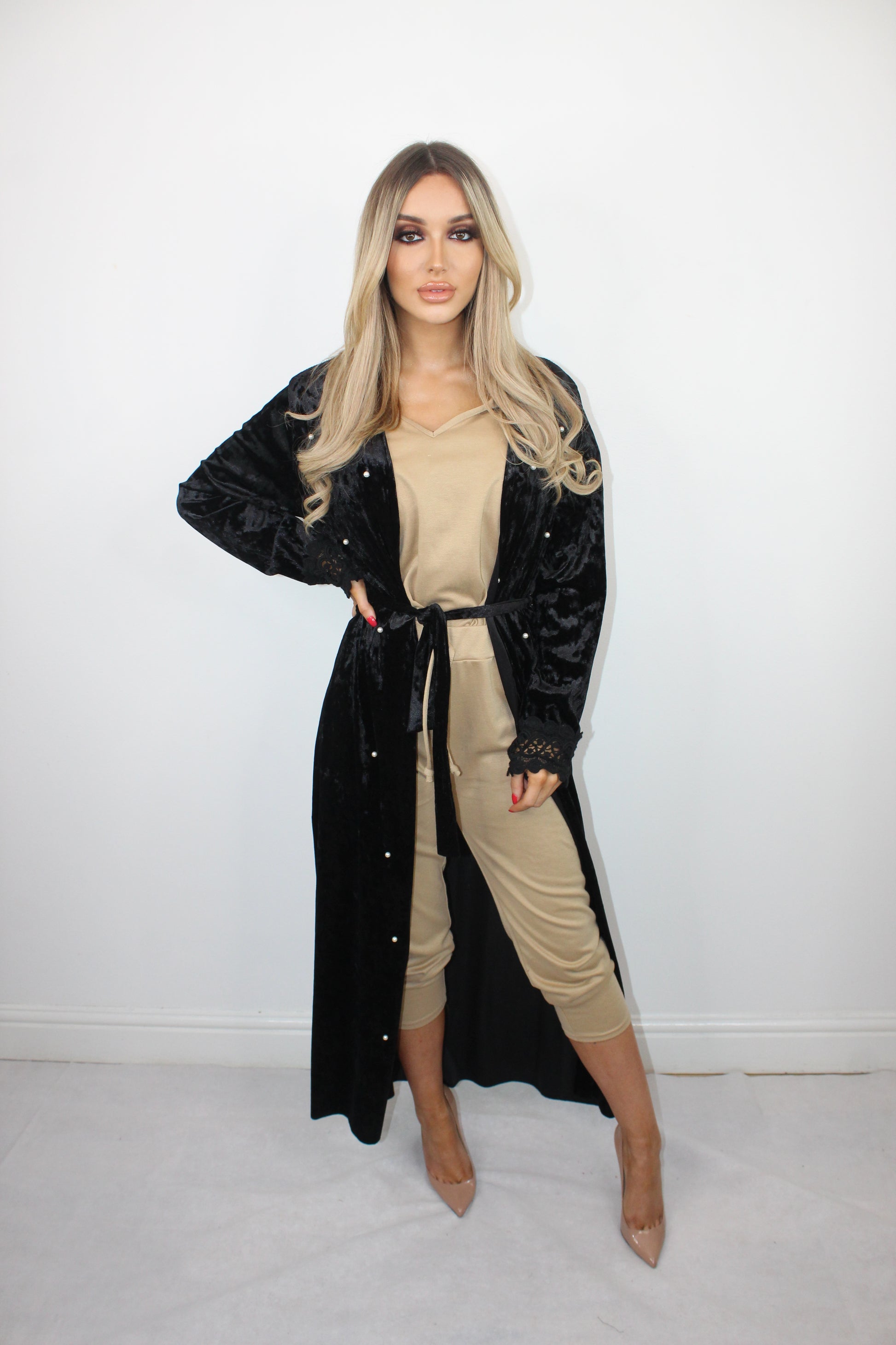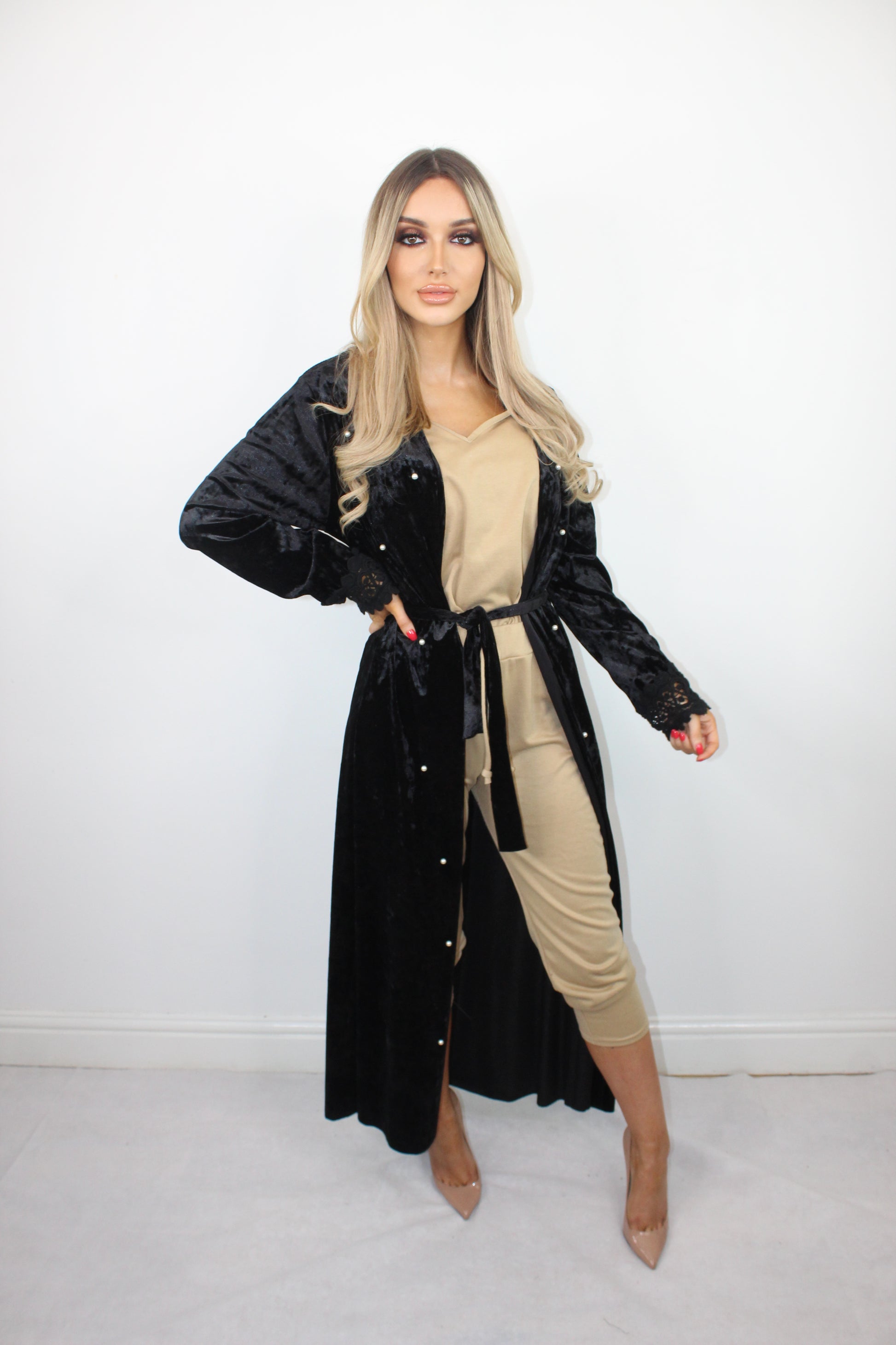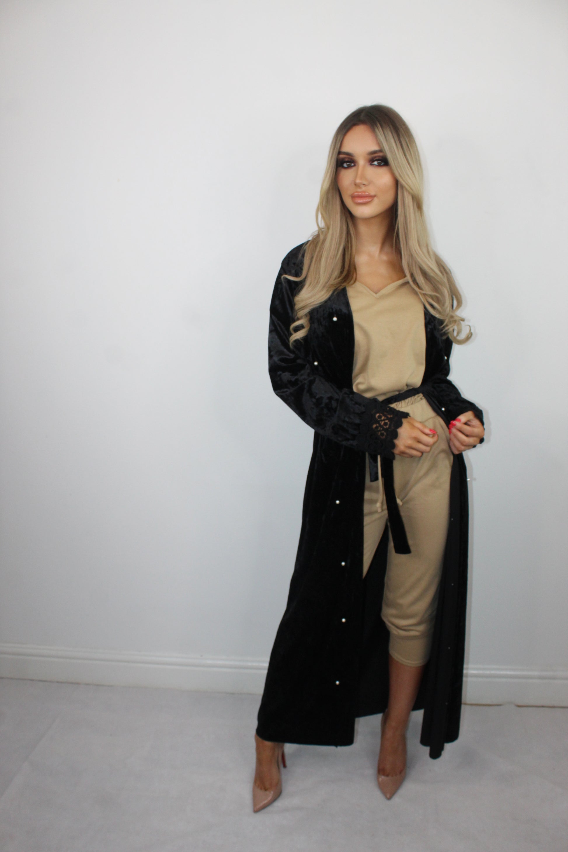 Black pearls velvet maxi jacket, gorgeous to wear over simple co ords.