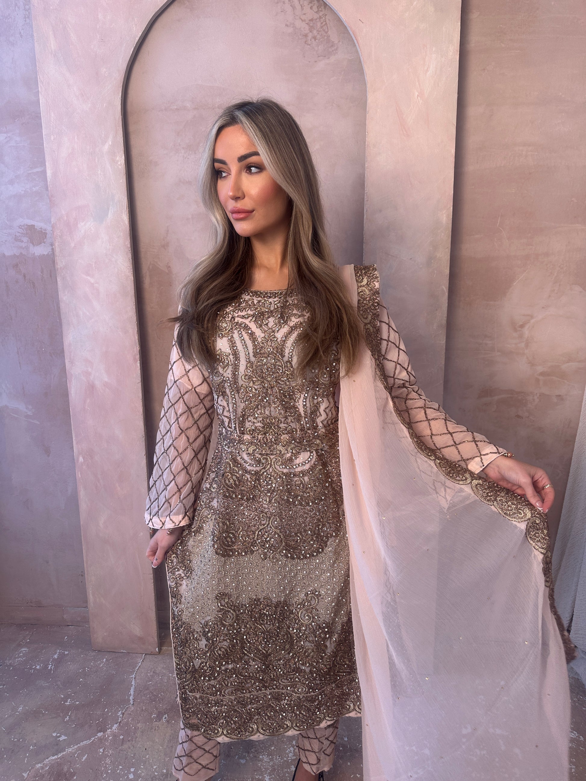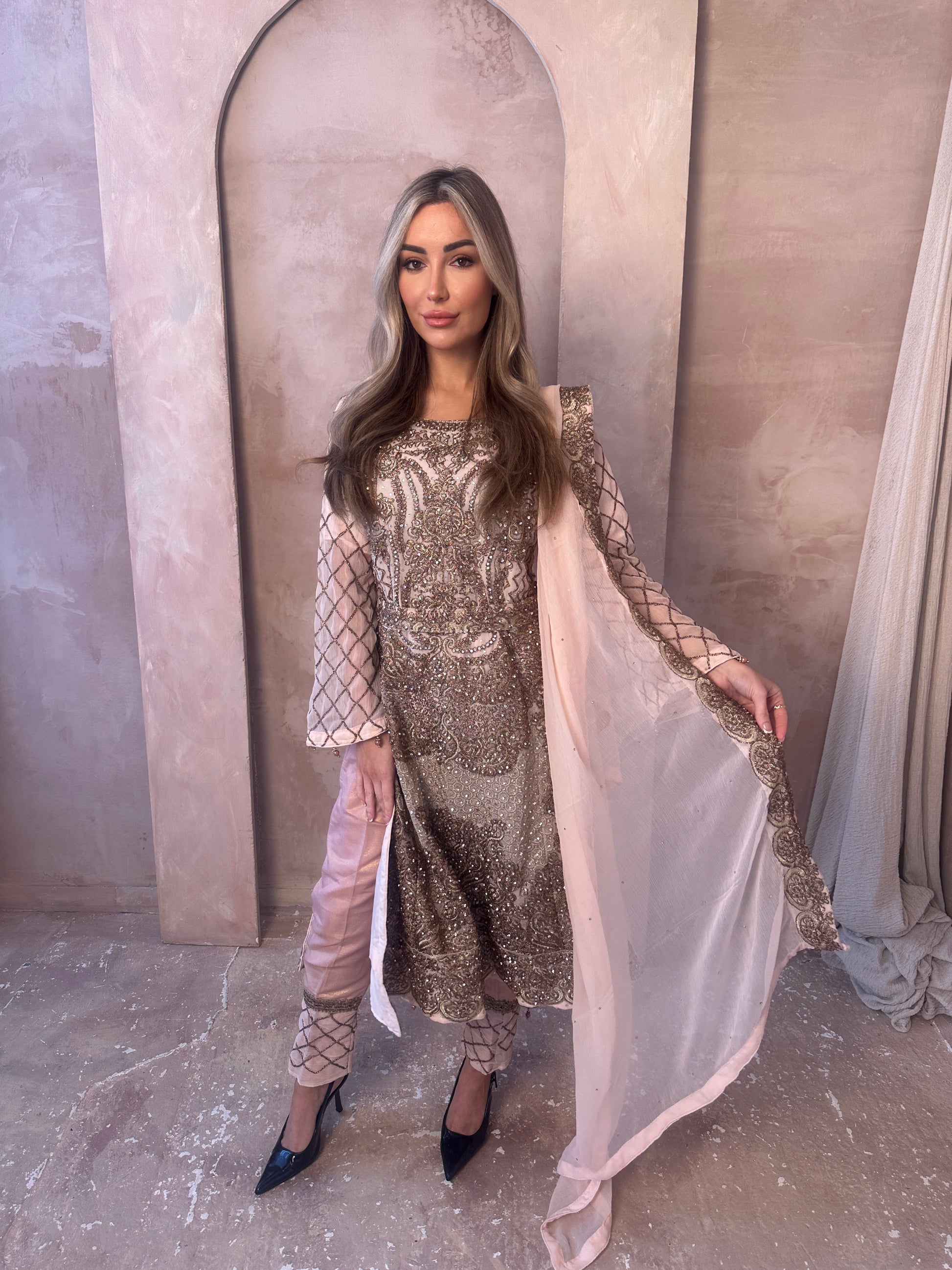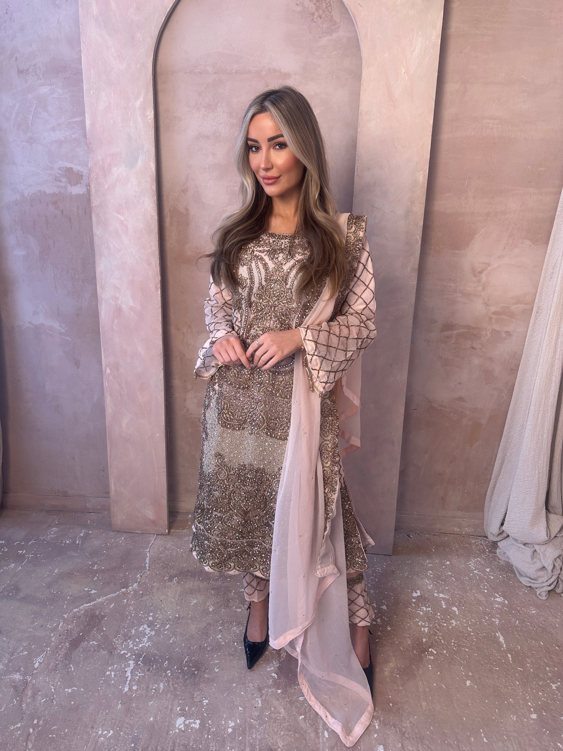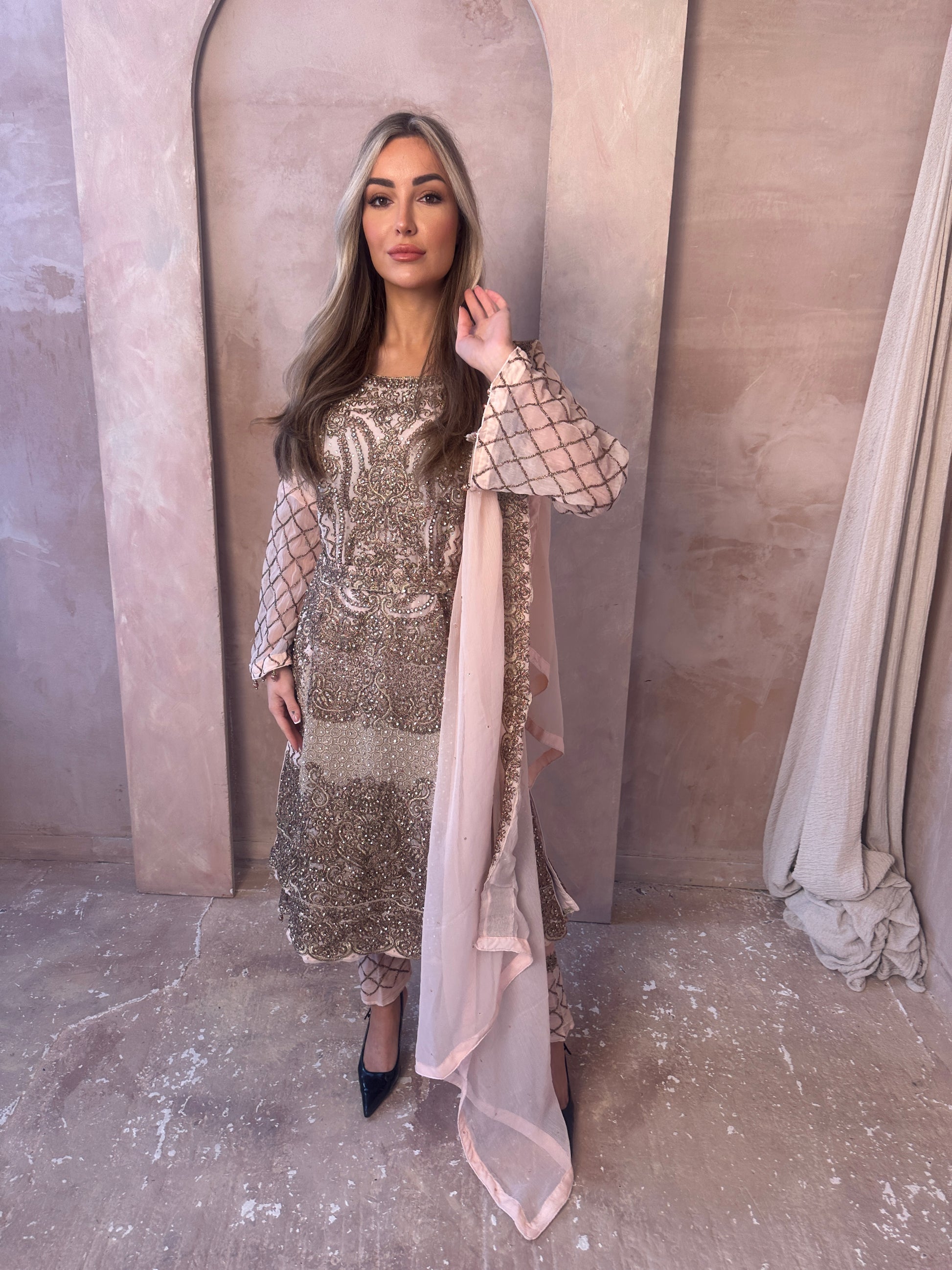 A cream nude pink silhouette with bronze work, long sleeve chiffon lined kameez shirt with bronze embroidery and embellishments on front and back, matching border work trousers and cream nude pink dupatta