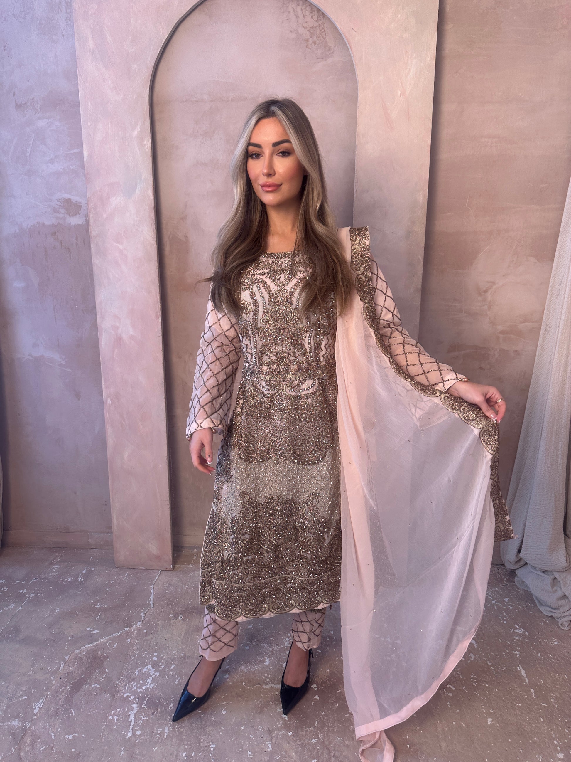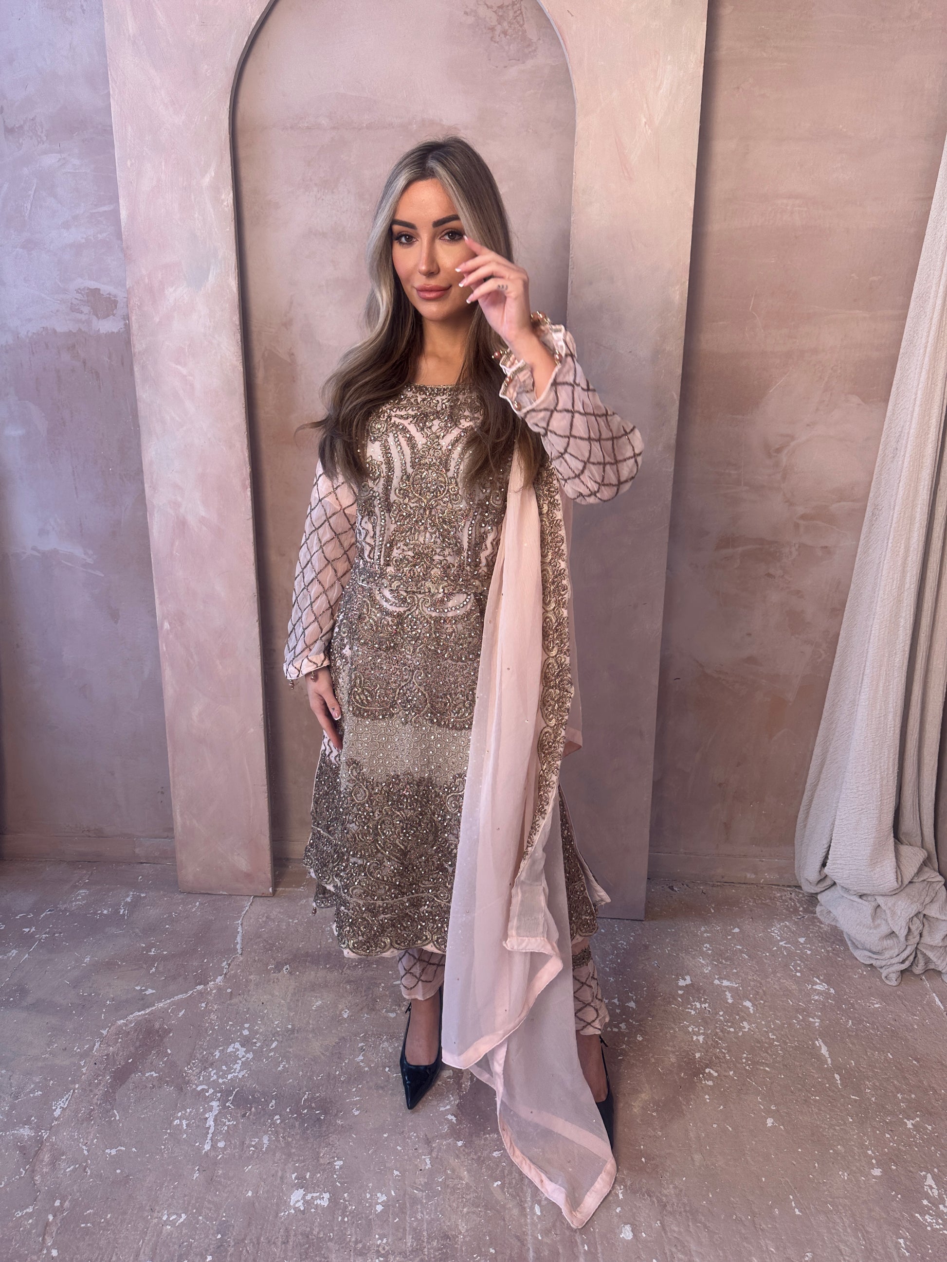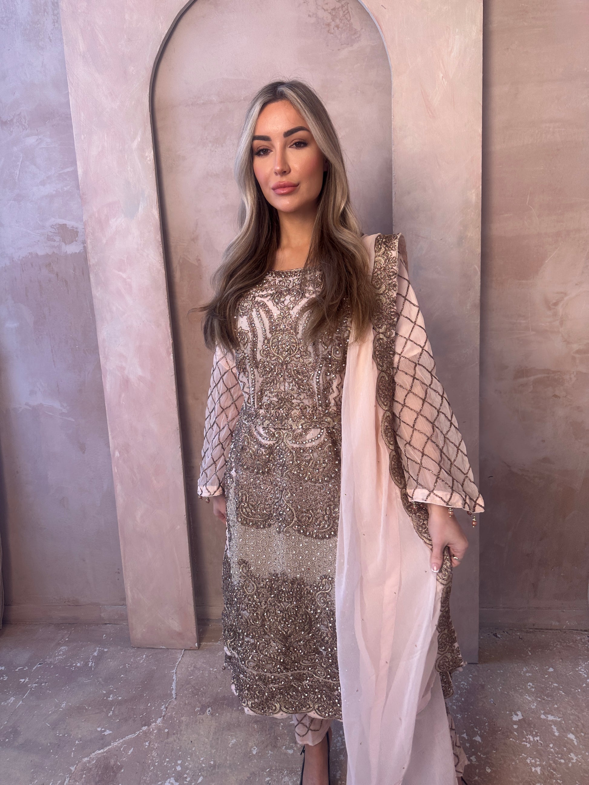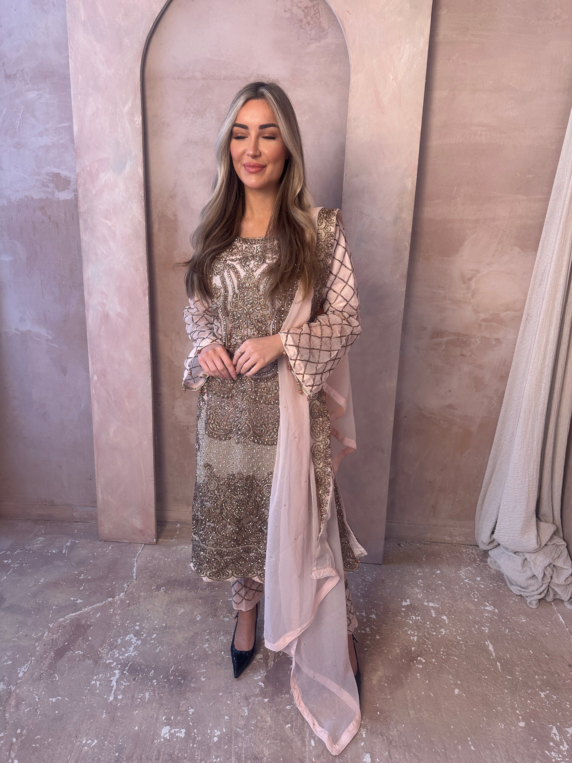 A cream nude pink silhouette with bronze work, long sleeve chiffon lined kameez shirt with bronze embroidery and embellishments on front and back, matching border work trousers and cream nude pink dupatta