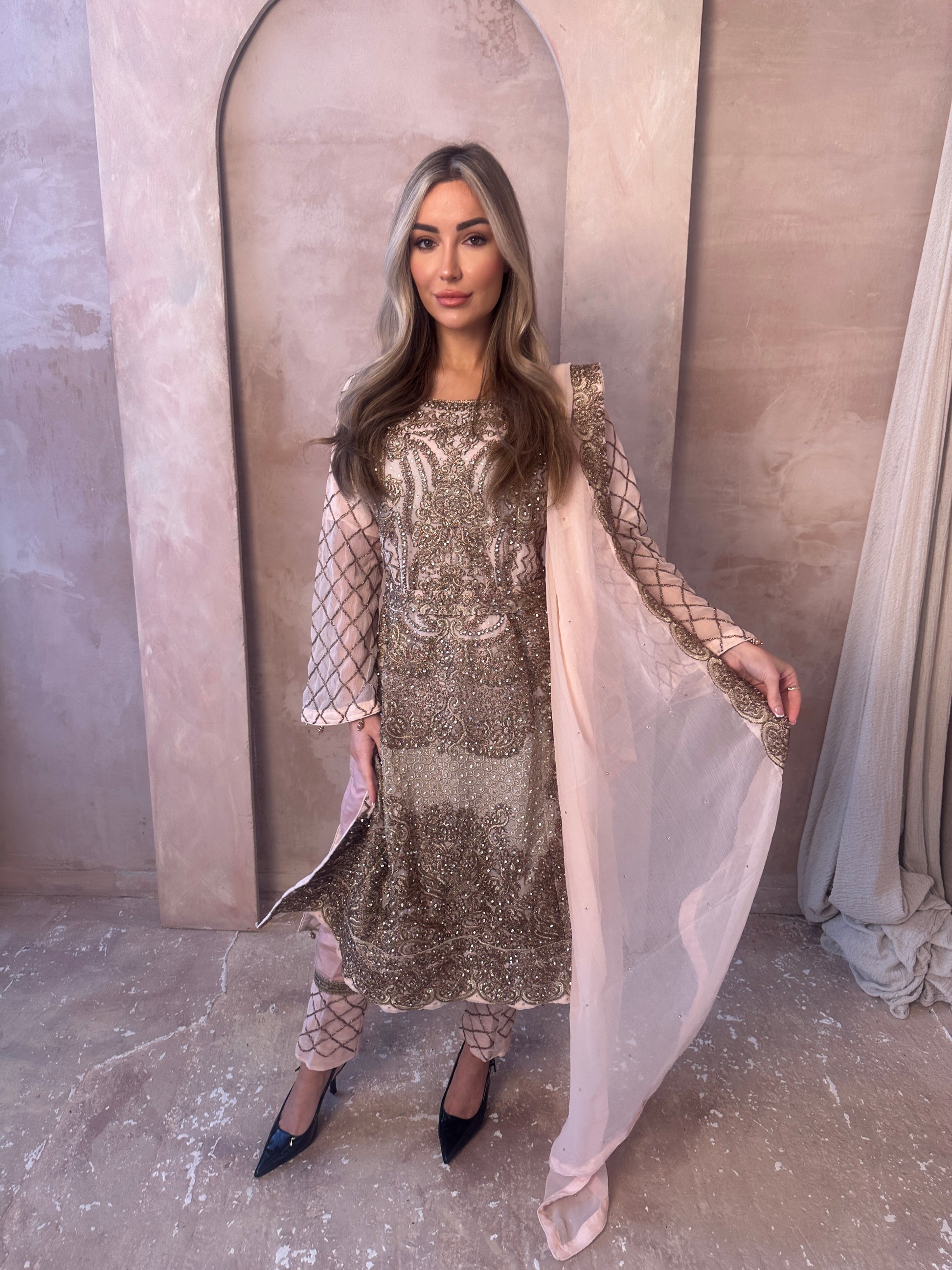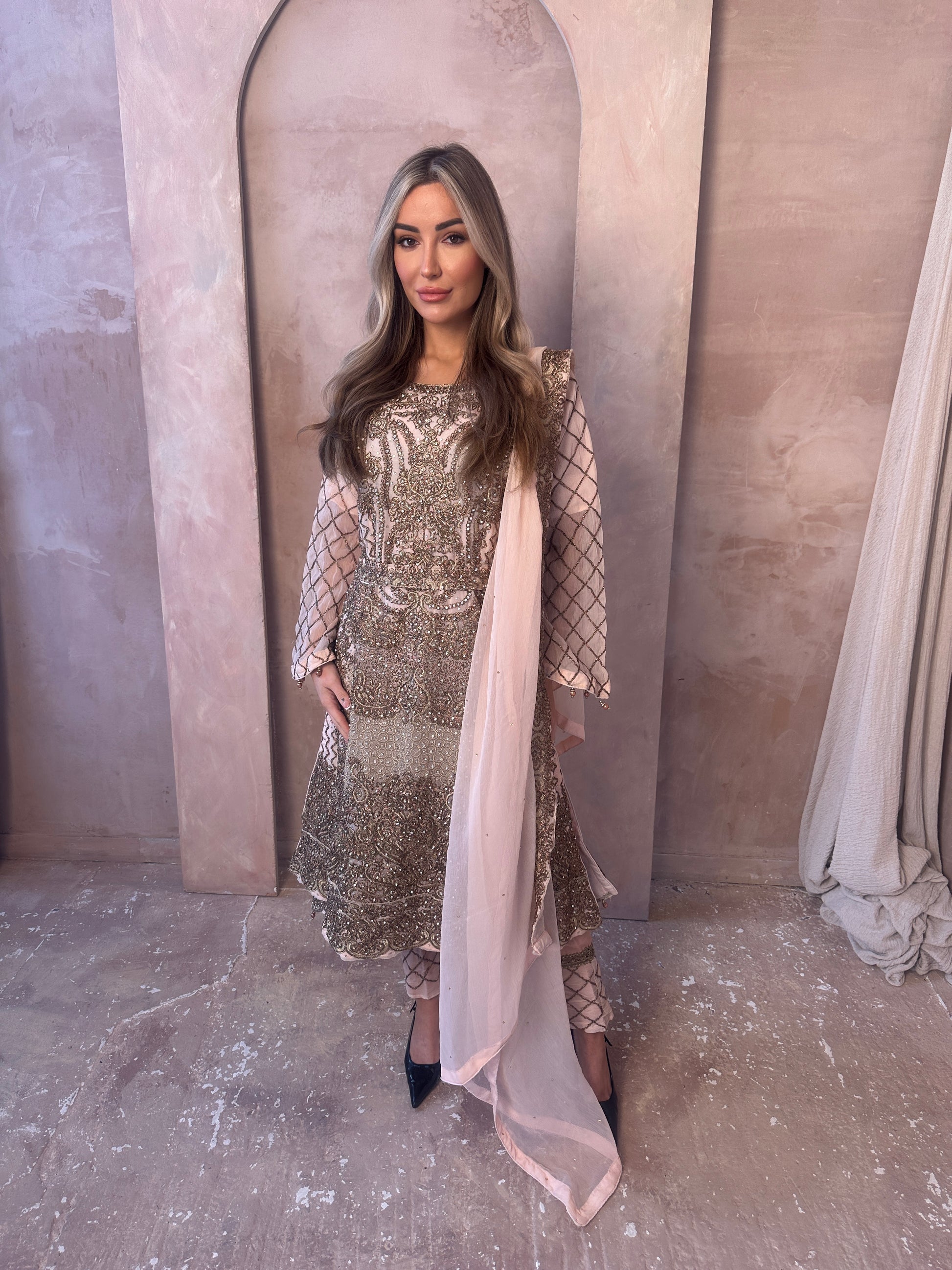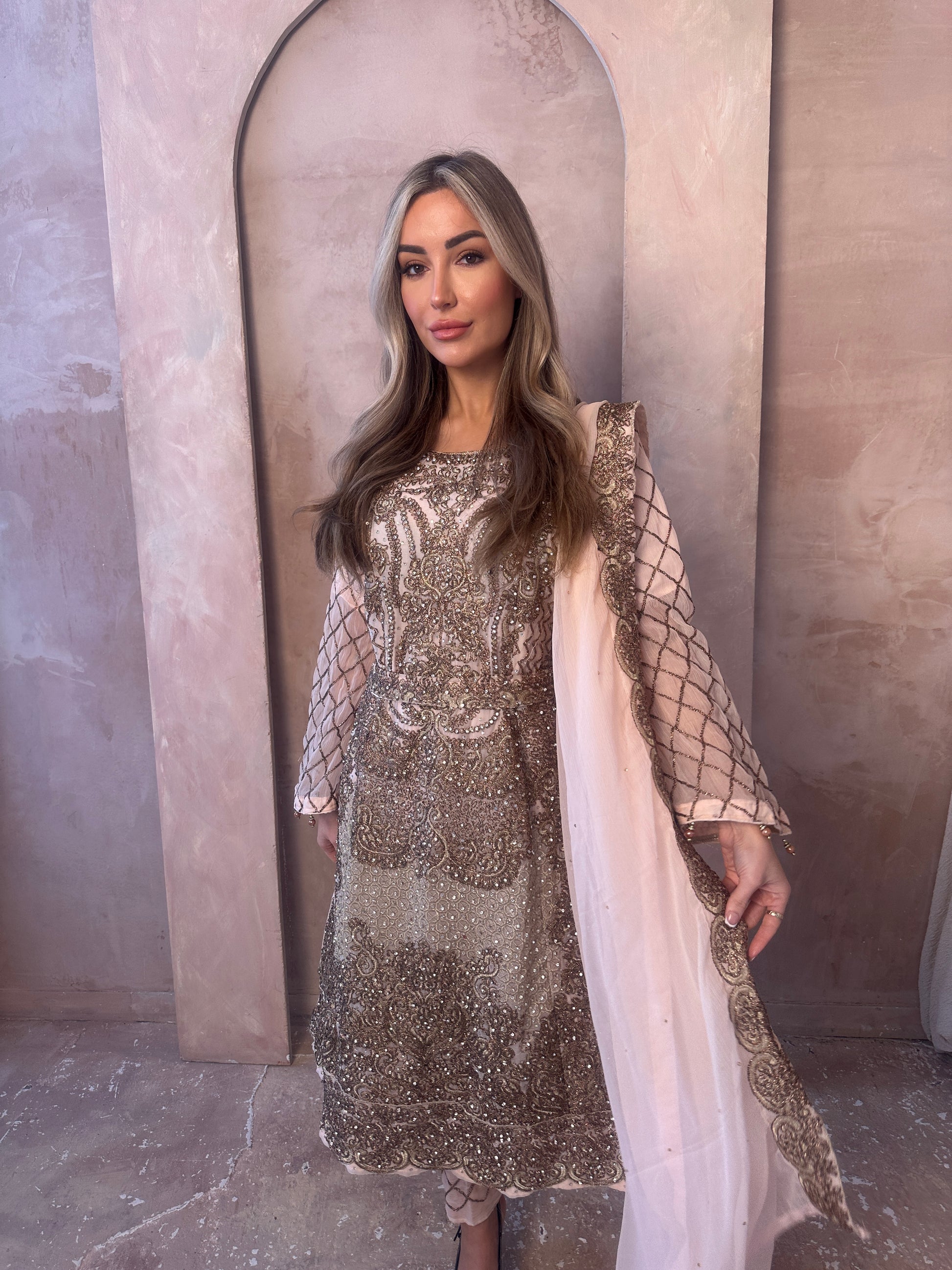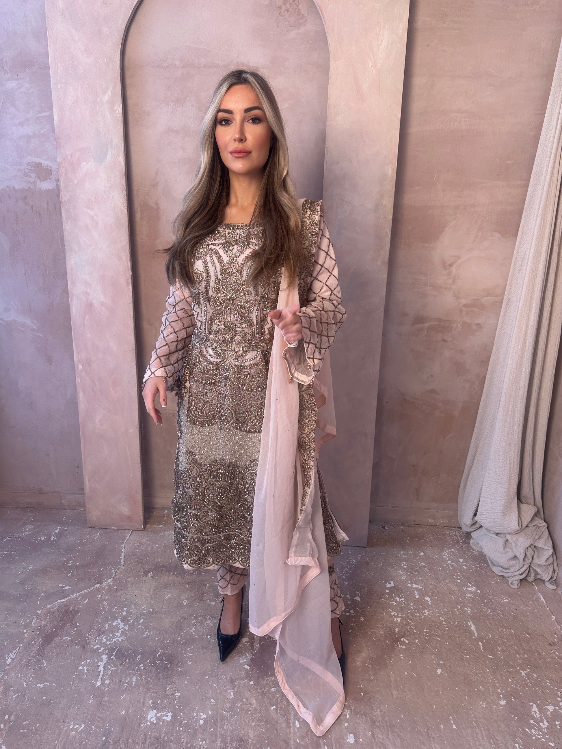 A cream nude pink silhouette with bronze work, long sleeve chiffon lined kameez shirt with bronze embroidery and embellishments on front and back, matching border work trousers and cream nude pink dupatta