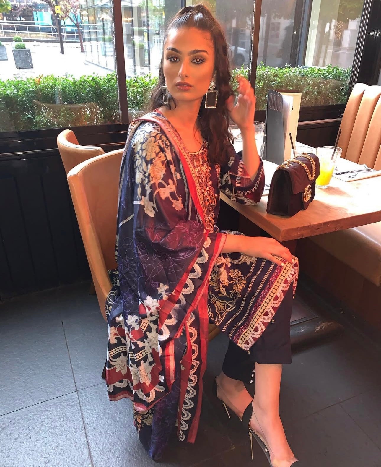 Chilled nights ready in soft linen fabric. A long sleeve navy embroidered shirt kameez with navy trousers and a navy print dupatta style up or down
