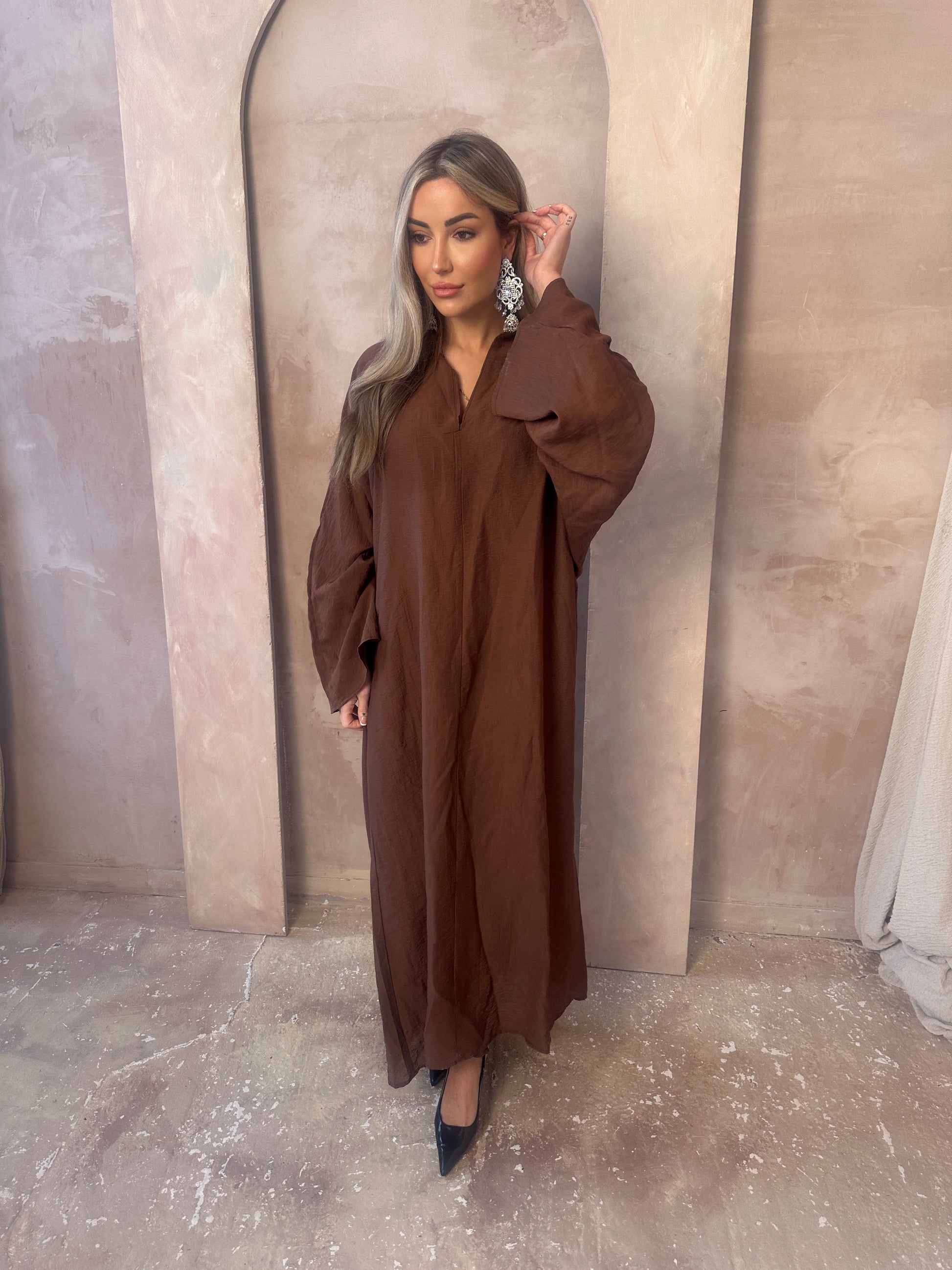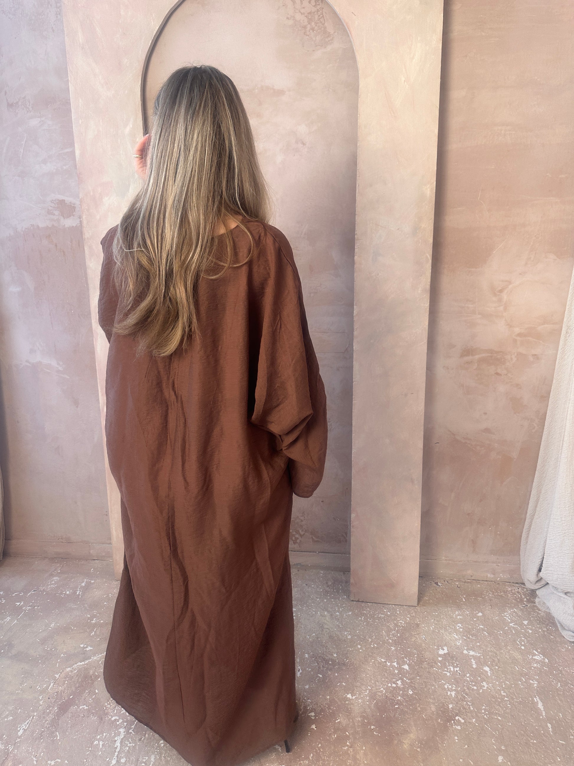 The prettiest simple and sophisticated kaftan in tones of chocolate brown ideal for brunches, dinner dates, holidays.