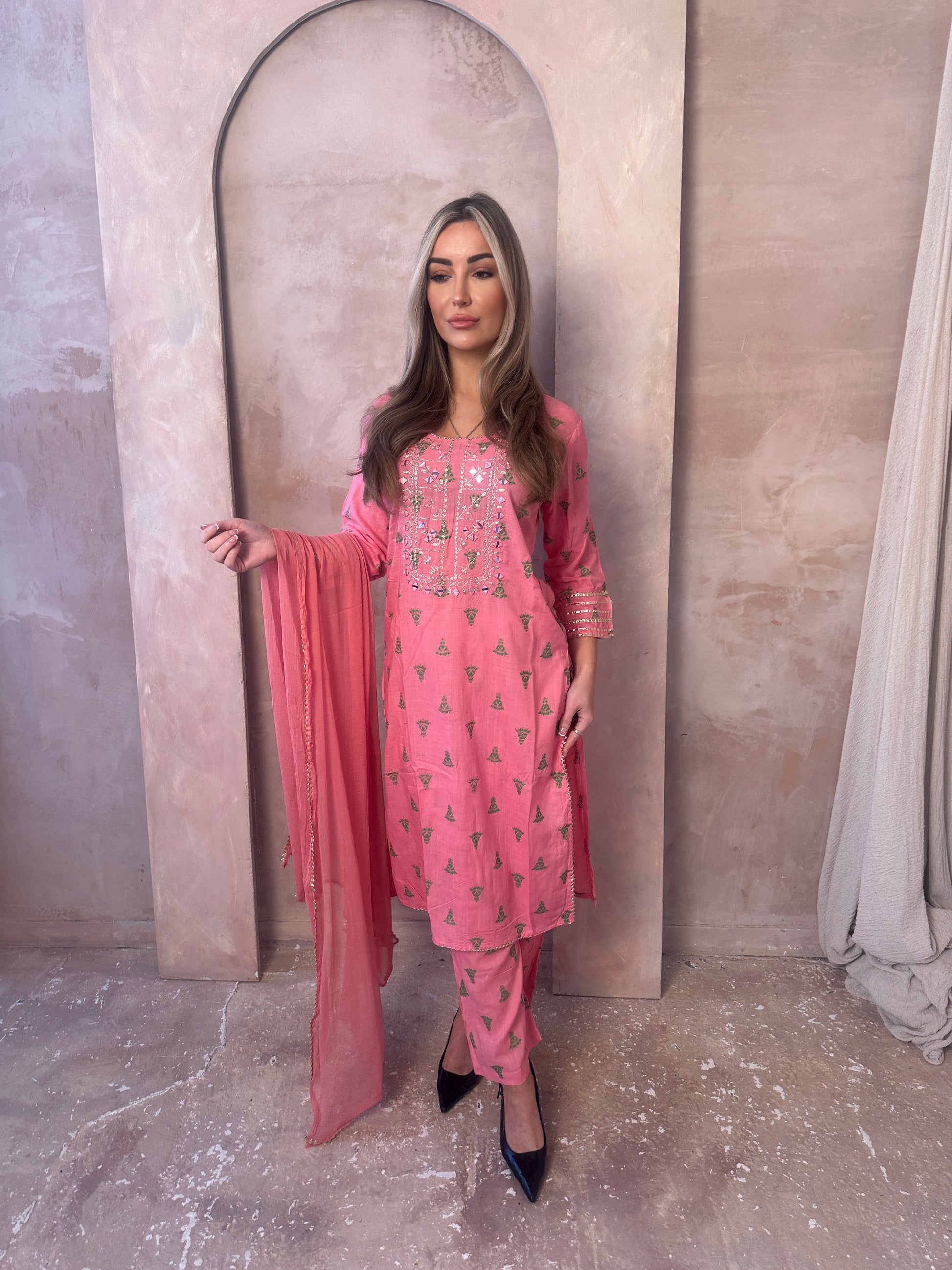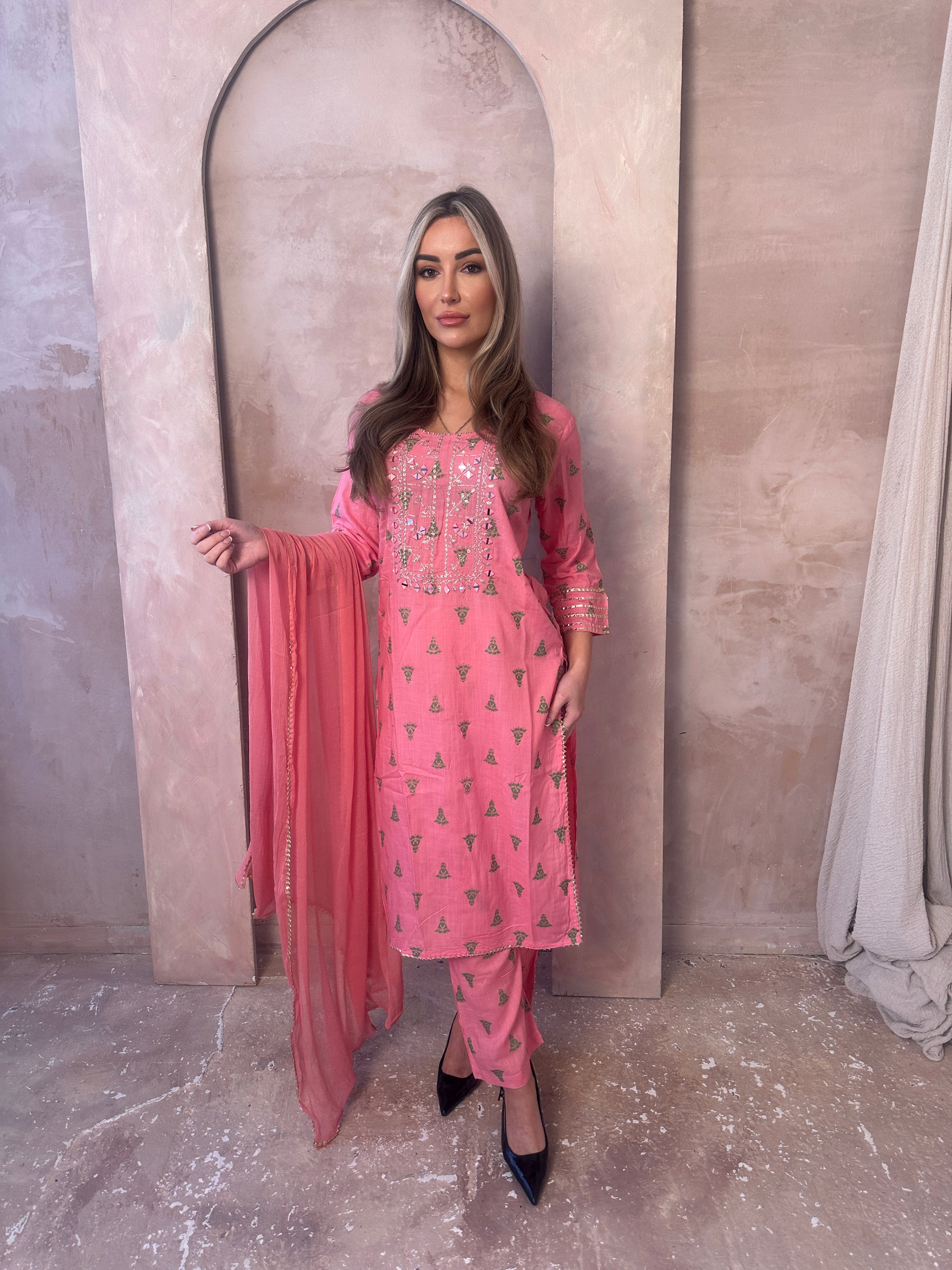 Blooming pink girly vibes for this spring. Long sleeve lawn printed pink and green outfit with embroidery and details, matching pink trousers and pink dupatta with gold border