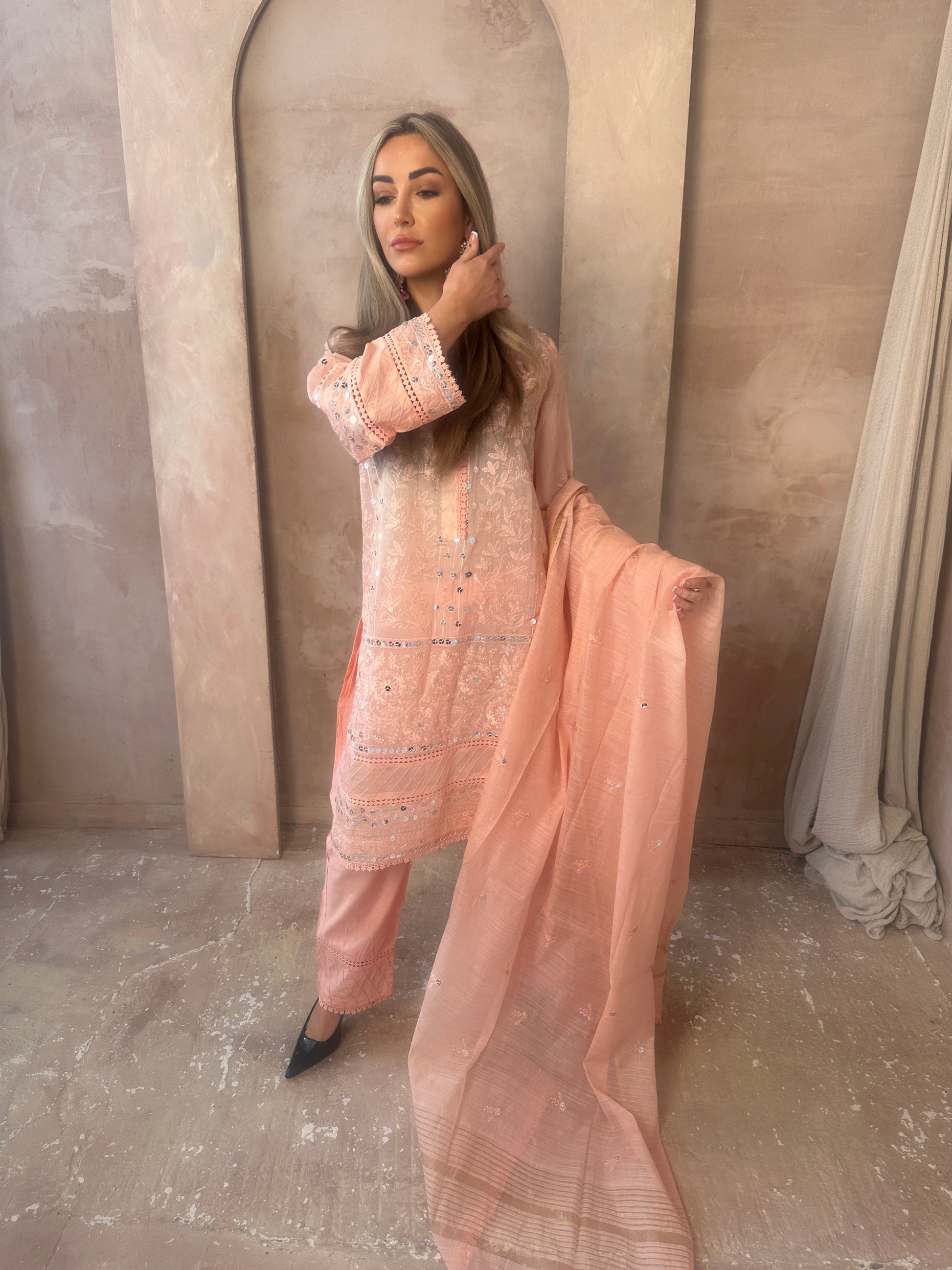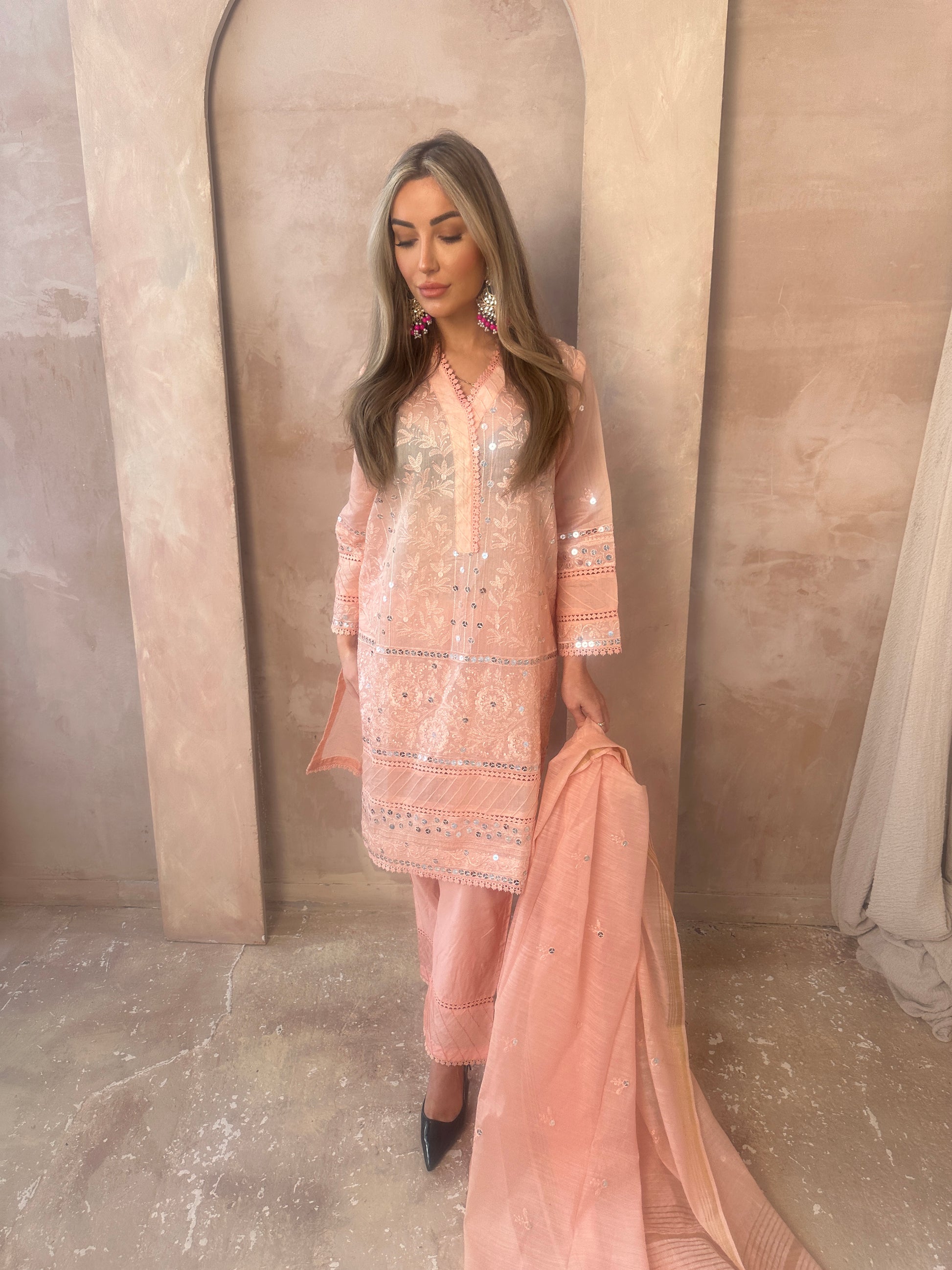A very beautiful peach pink look. Long sleeve lawn embroidered shirt kameez with sequin details and gorgeous embroidery and matching trousers and dupatta with gold details on the dupatta