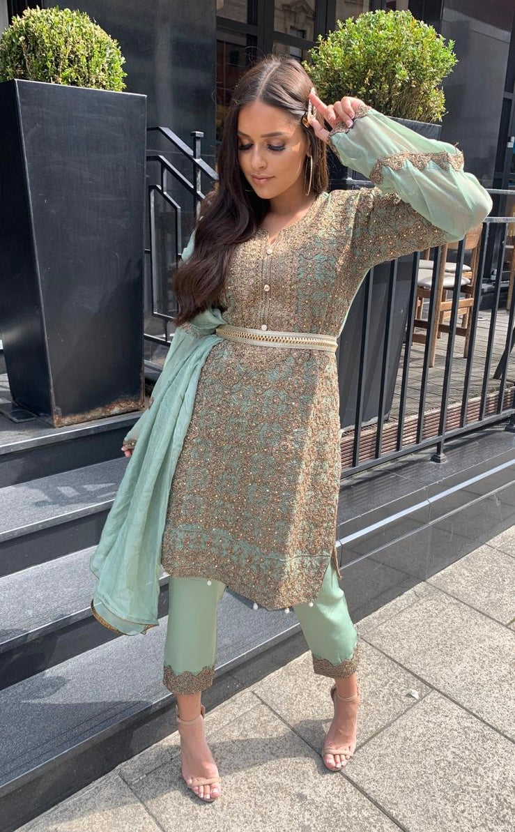 Add a touch of pastel elegance to your wardrobe. A mint green and gold chiffon piece, long bell sleeved shaped arm kameez shirt lined and adorned with gorgeous embroidery and matching trousers and dupatta
