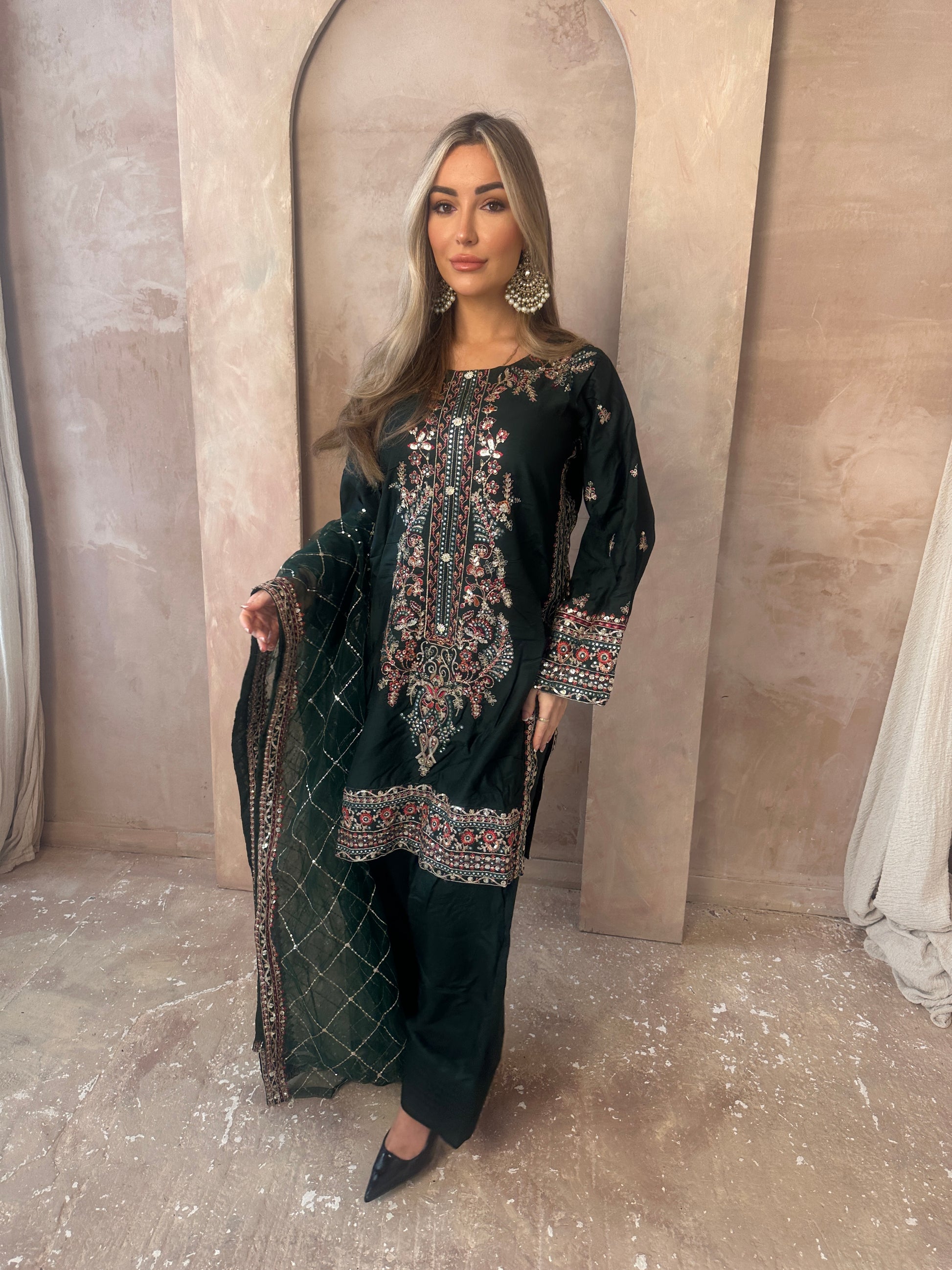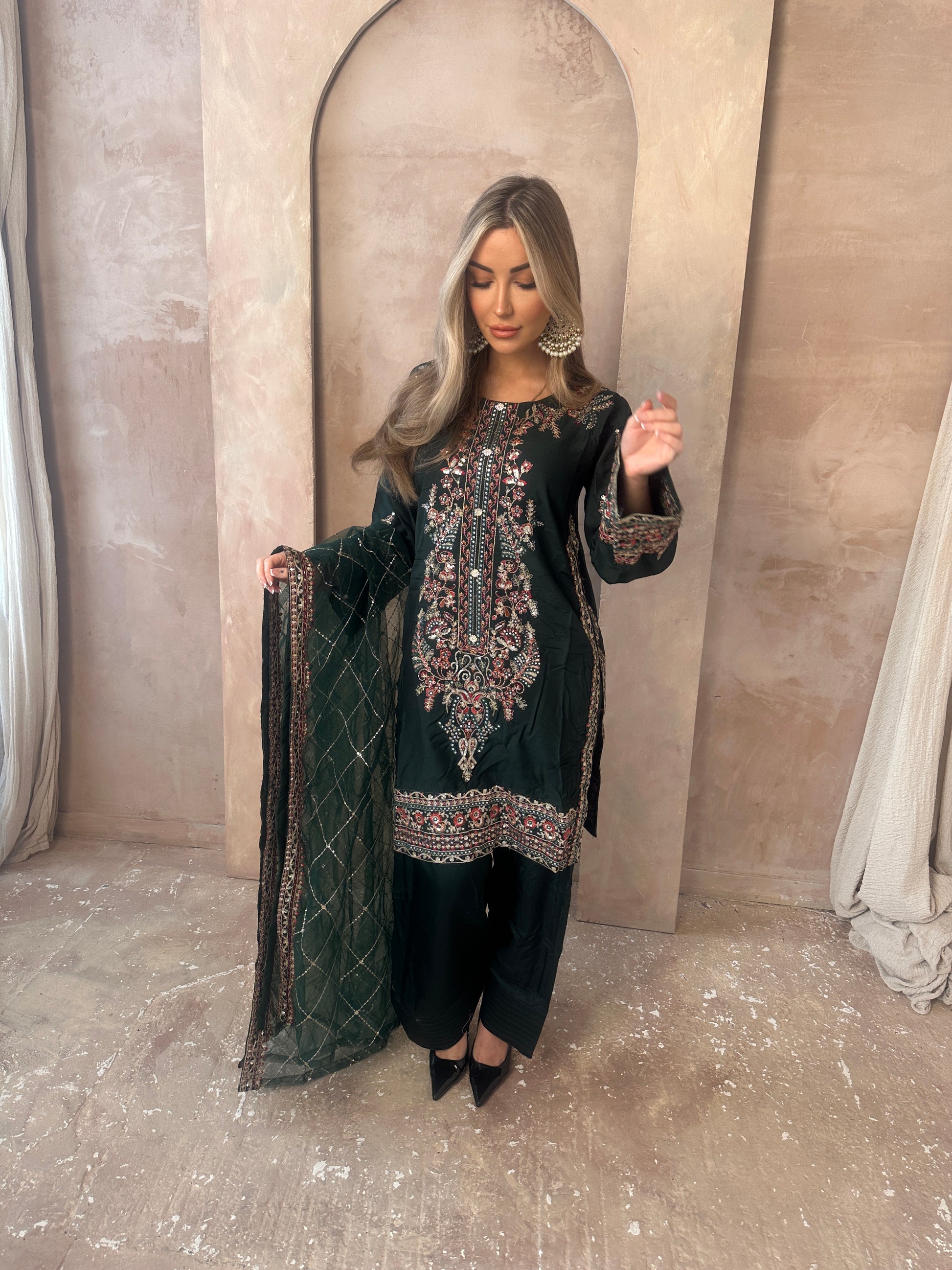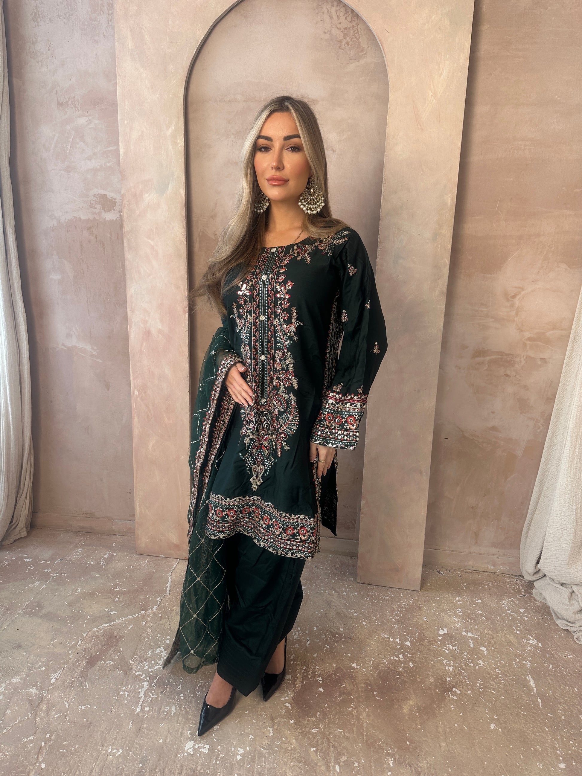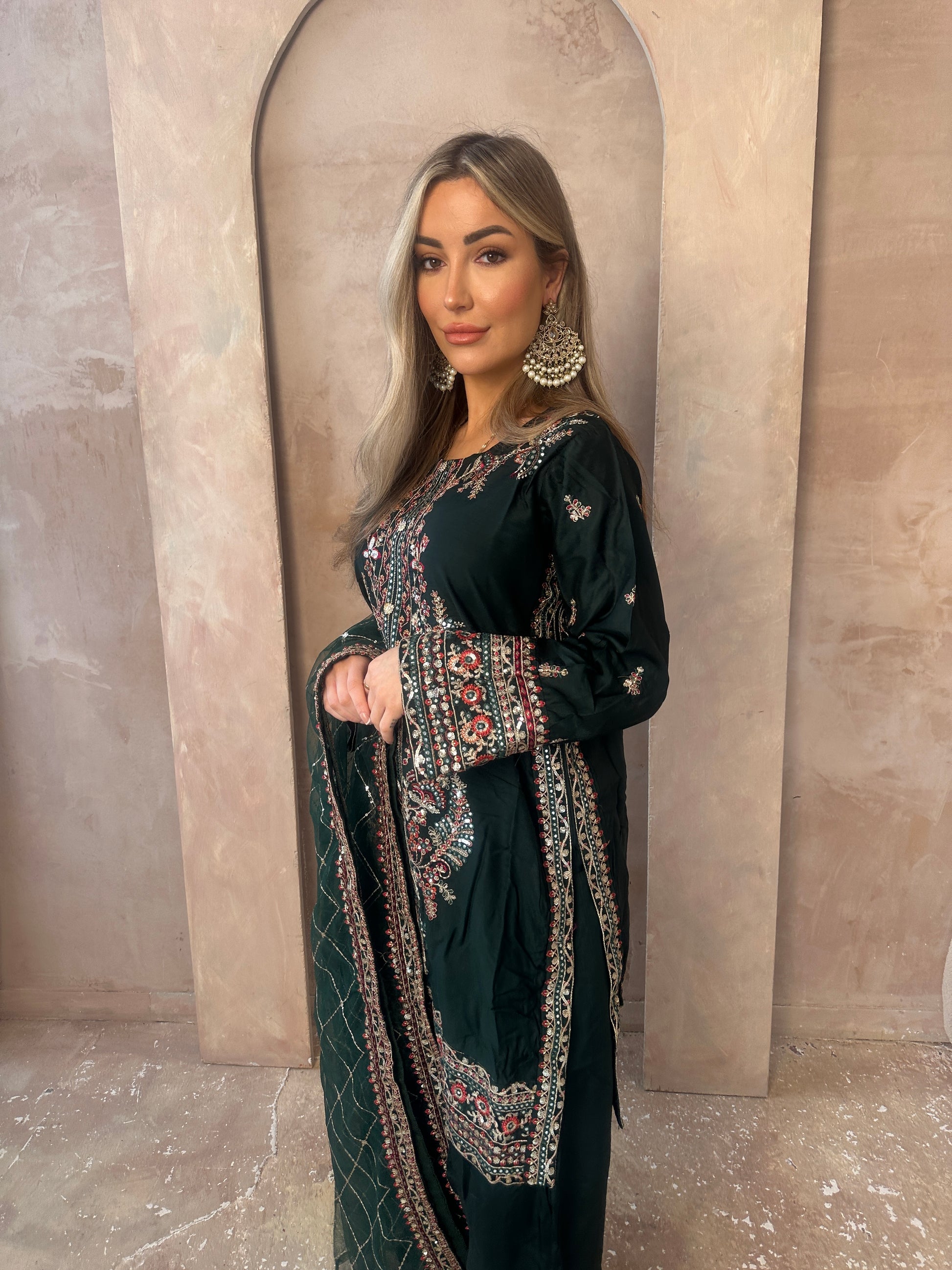 Stunning Green moodboard. A long sleeve green statement capsule, intricate gold work, neckline with added details, green shalwar trousers and a very blooming green and gold dupatta