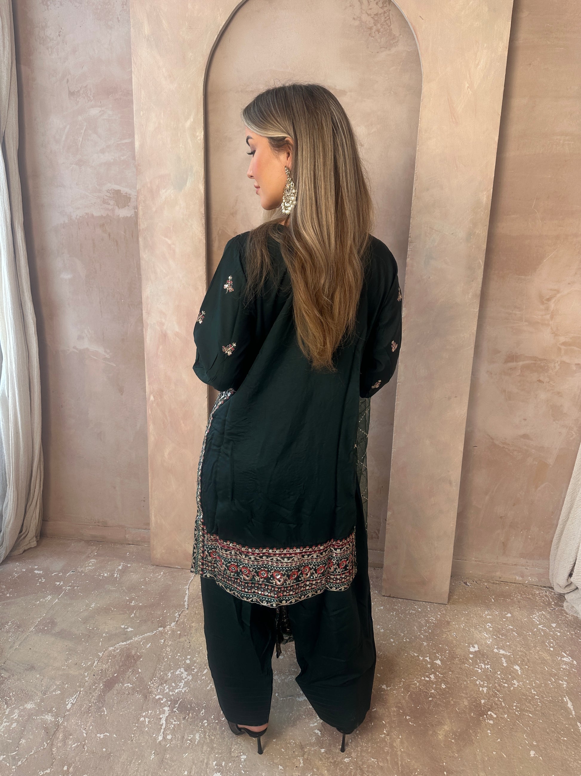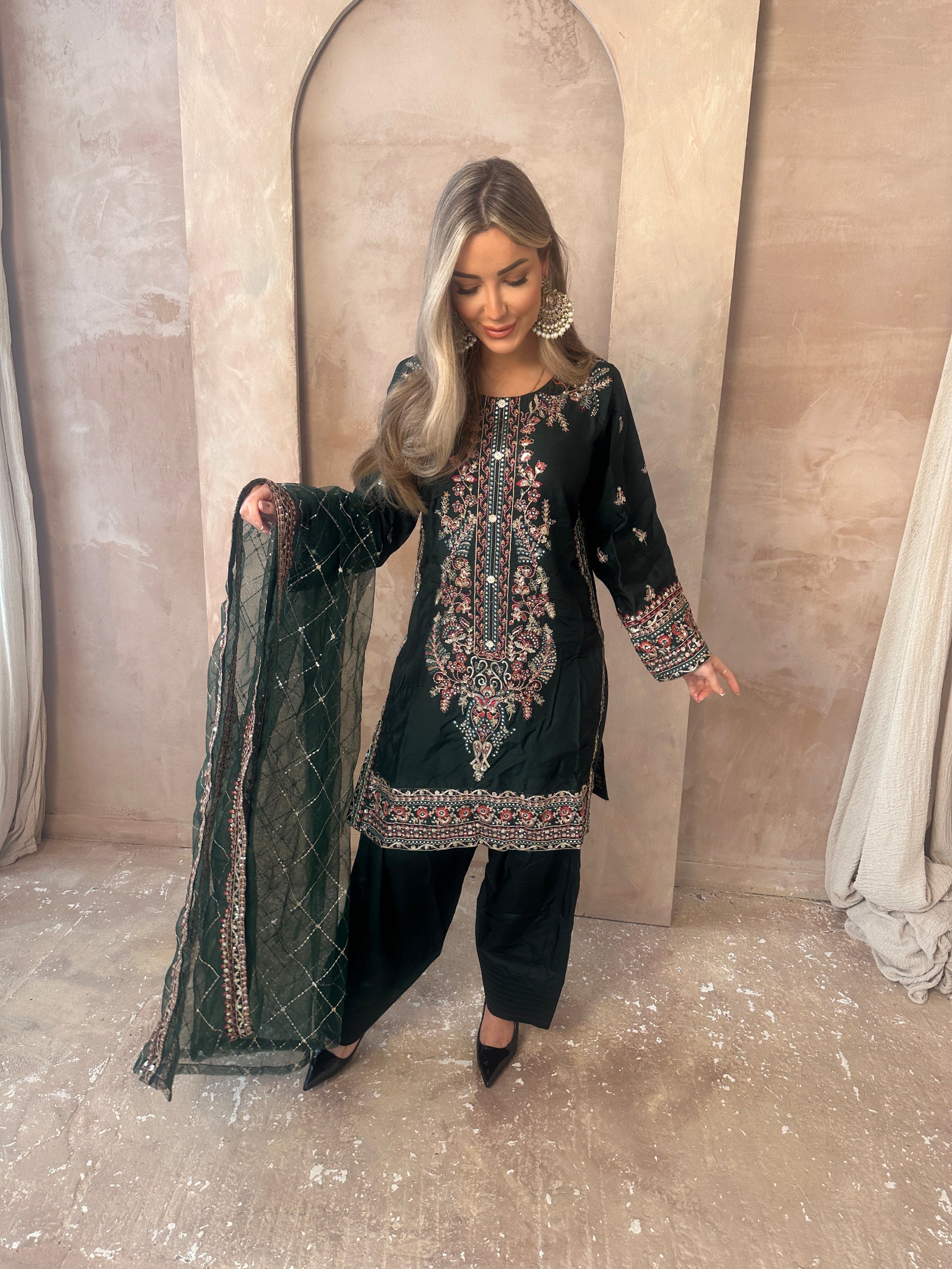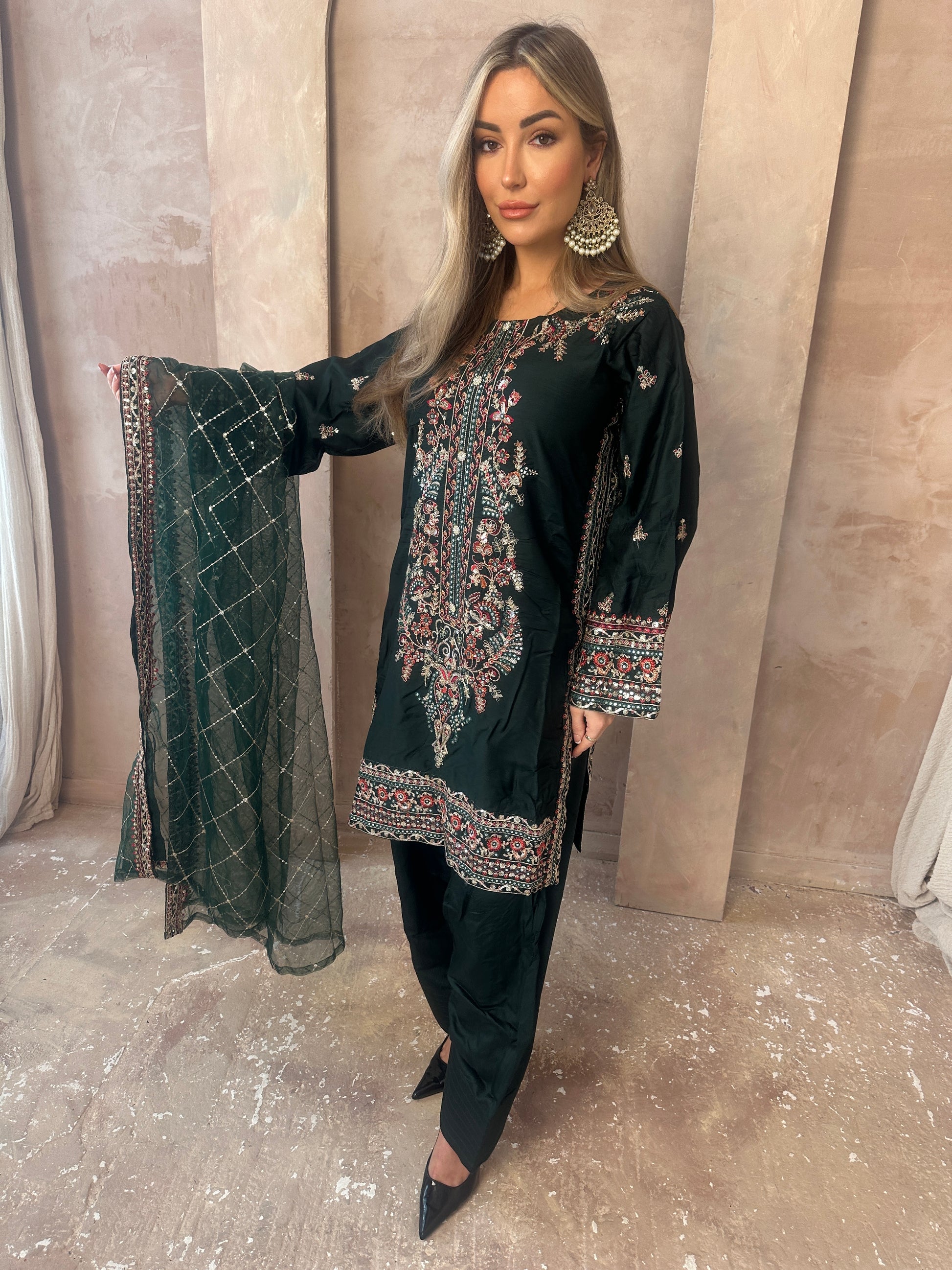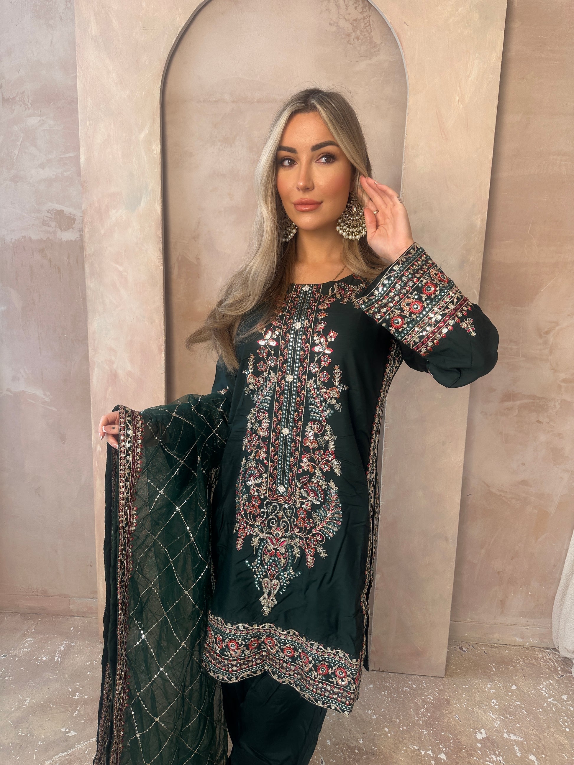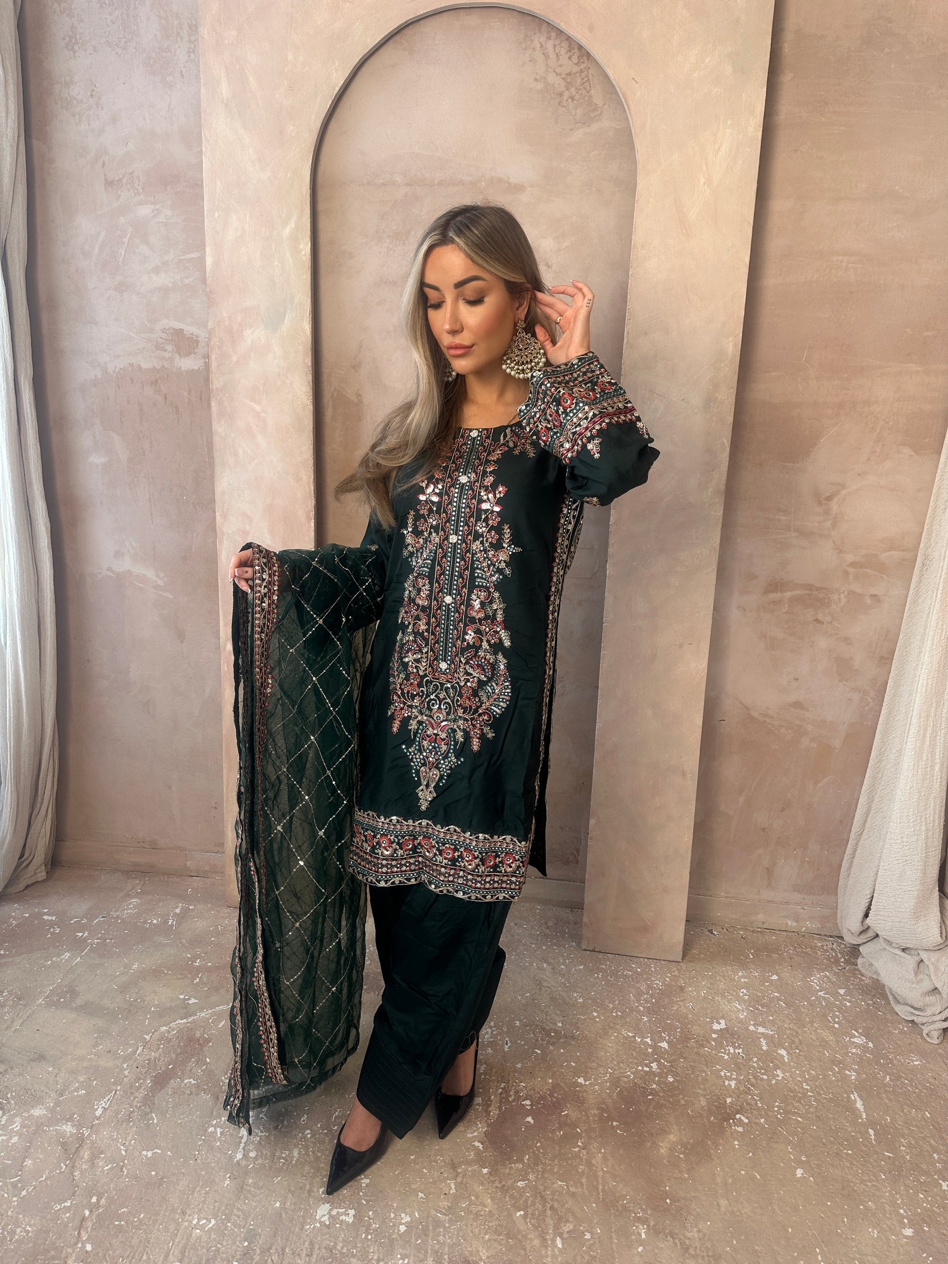 Stunning Green moodboard. A long sleeve green statement capsule, intricate gold work, neckline with added details, green shalwar trousers and a very blooming green and gold dupatta