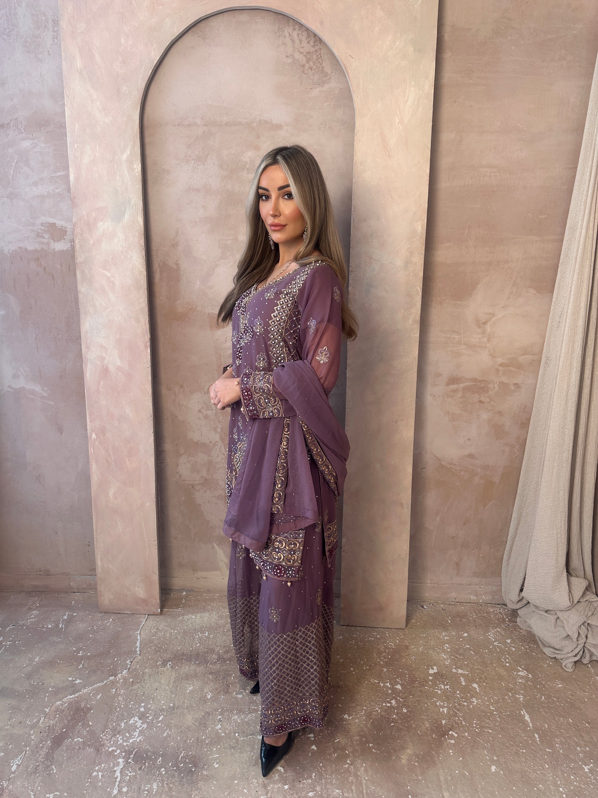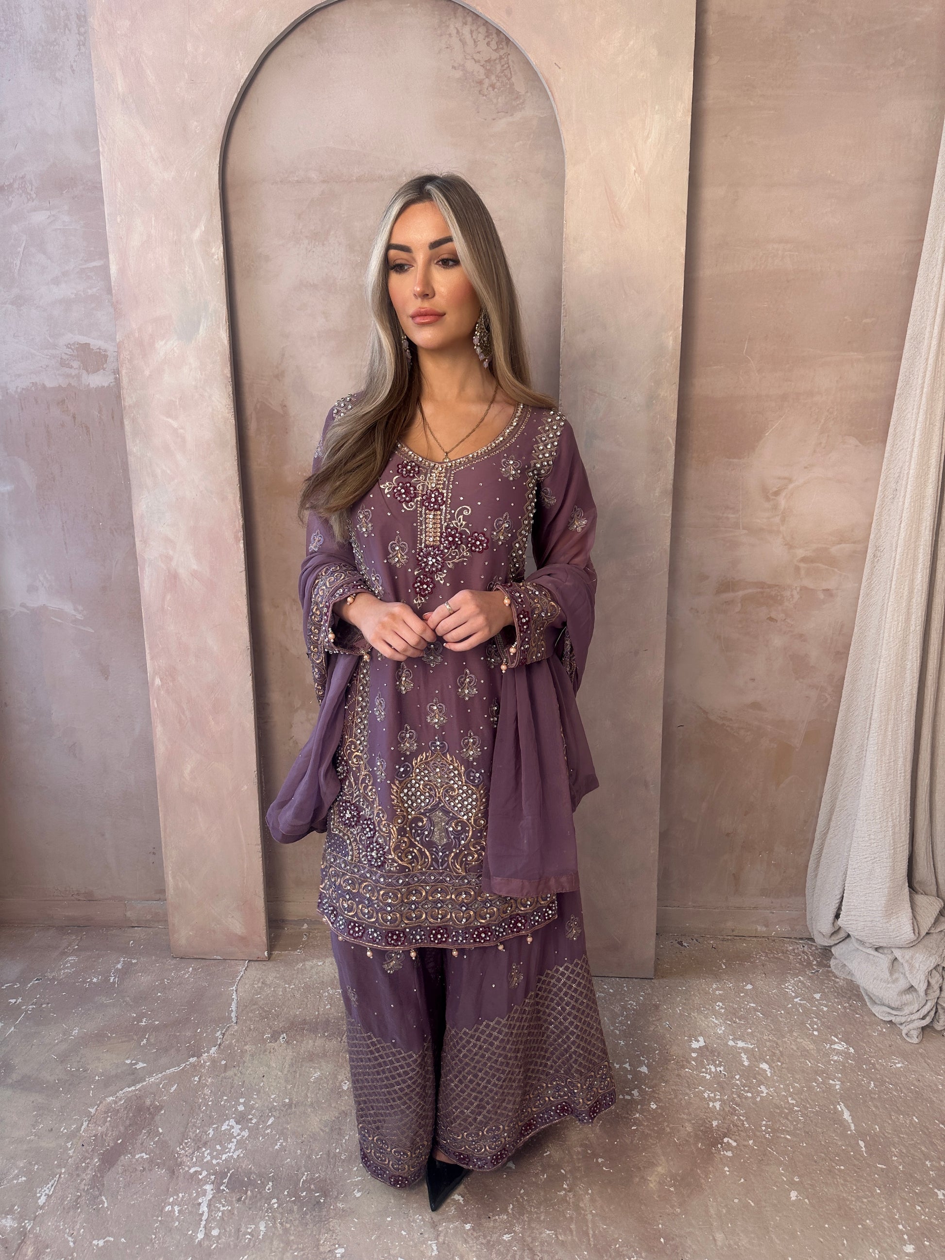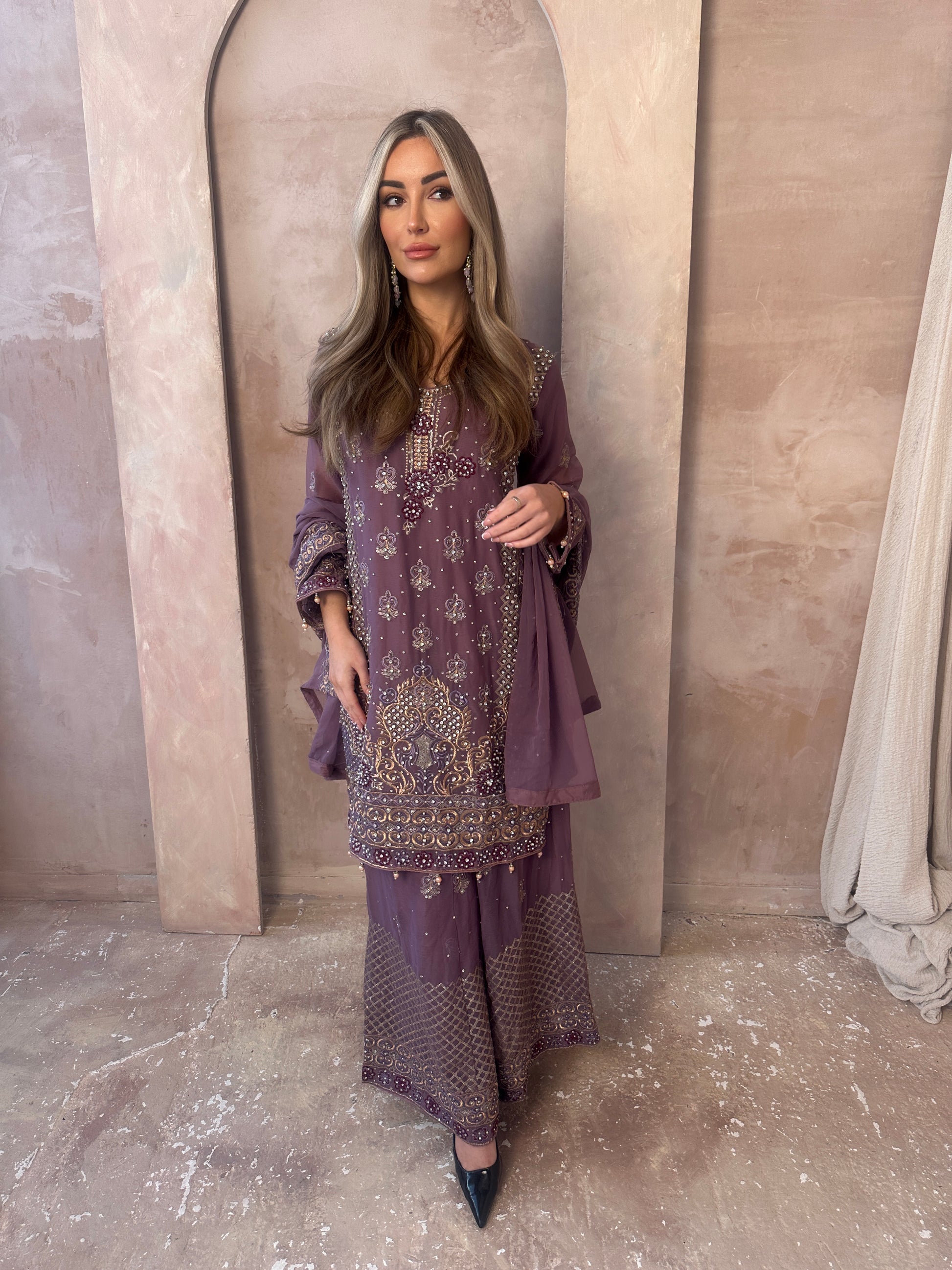 A gorgeous spring lilac mauve look. georgette flare trousers fit. Long sleeve lilac georgette embroidered short kameez with beautiful embroidery and details, flare trousers with hand stone work, and embellishments, and a lilac border work georgette chiffon dupatta